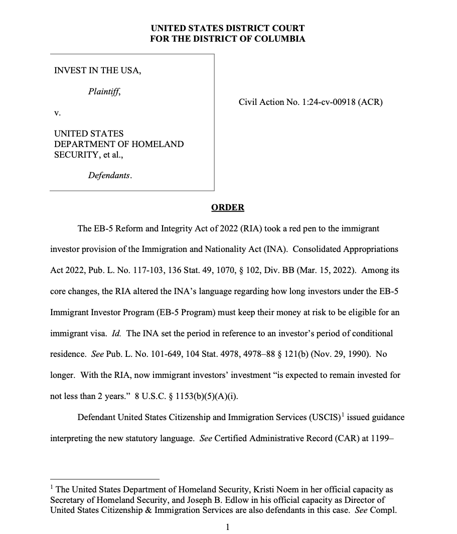 2025年7月29日,美國哥倫比亞特區聯邦地區法院就IIUSA(美國EB-5區域中心產業協會)訴美國公民及移民服務局(USCIS)一案作出裁定,再次將EB-5投資人最關注的「資金維持期」問題推向聚光燈。