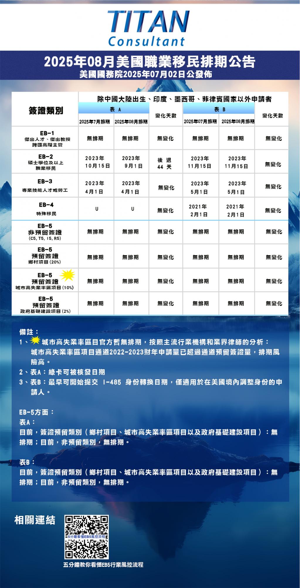 表B:表B也稱為遞件排期,適用於那些在美國境內調整身分的申請人。如果表B排期到了,且移民局允許使用表B排期,申請人可以遞交I-485表格進行身分調整。對於不在美國的申請人,表A才是他們主要參考的排期。