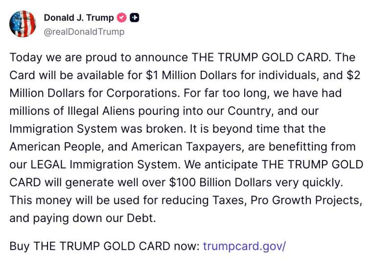 美國總統川普近日宣布推出全新移民方案「川普金卡」(Trump Gold Card),個人申請費為 100 萬美元,而企業或類似實體若代表個人申請,則需繳納 200 萬美元。