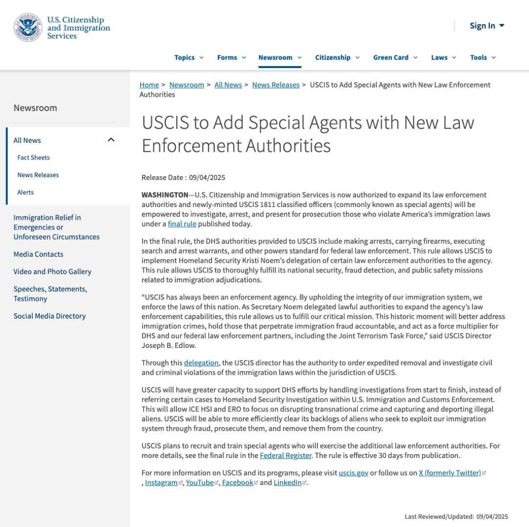 美國時間9月4日,美國移民局(USCIS)發佈了一則重磅消息,即將迎來重大變革,其職能不再局限於 「審批綠卡簽證」,而是將擁有真正的執法權力。 根據最新公佈的聯邦規則,USCIS將成立一支 1811 特別探員隊伍(special agents),這些探員將具備與其他聯邦執法部門類似的廣泛權力。