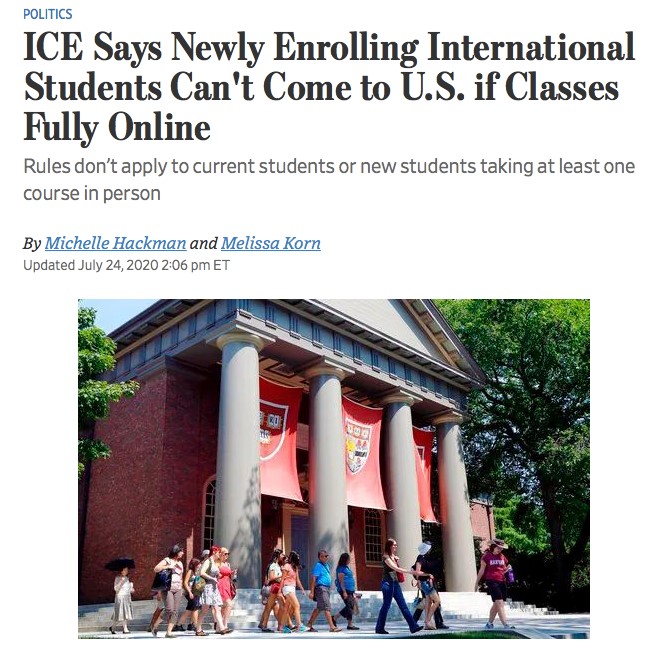 美國移民與海關執法局(ICE)於當地時間7月24日在其官網發佈新政策指南,指出如果所在大學2020年秋季學期全面採取視訊授課,那麼今年秋季學期新入學的國際學生將不會獲得赴美簽證,不得入境。除此之外,還指出美國的學校不應該給此類大學新生核發I-20文件。